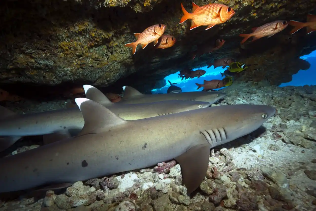 • Biota besar: hiu karang, giant trevally, kadang-kadang sunfish